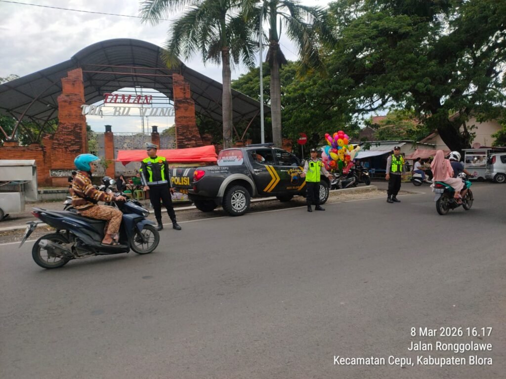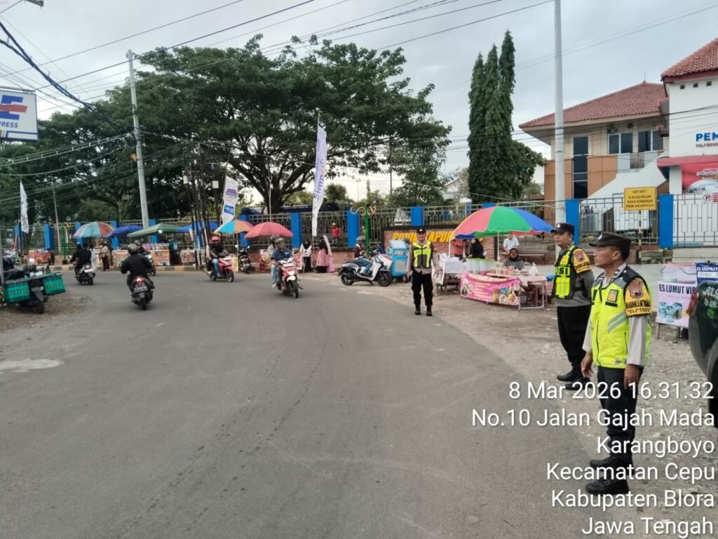 BLORA – Personel Polsek Cepu Polres Blora melaksanakan patroli intensif di sejumlah titik keramaian guna memastikan keamanan dan kenyamanan masyarakat yang sedang beraktivitas menjelang berbuka puasa, Minggu (8/3/2026) sore. Patroli cipta kondisi ini difokuskan pada pusat penjualan takjil dan area publik yang menjadi titik kumpul warga selama bulan suci Ramadan 1447 H.